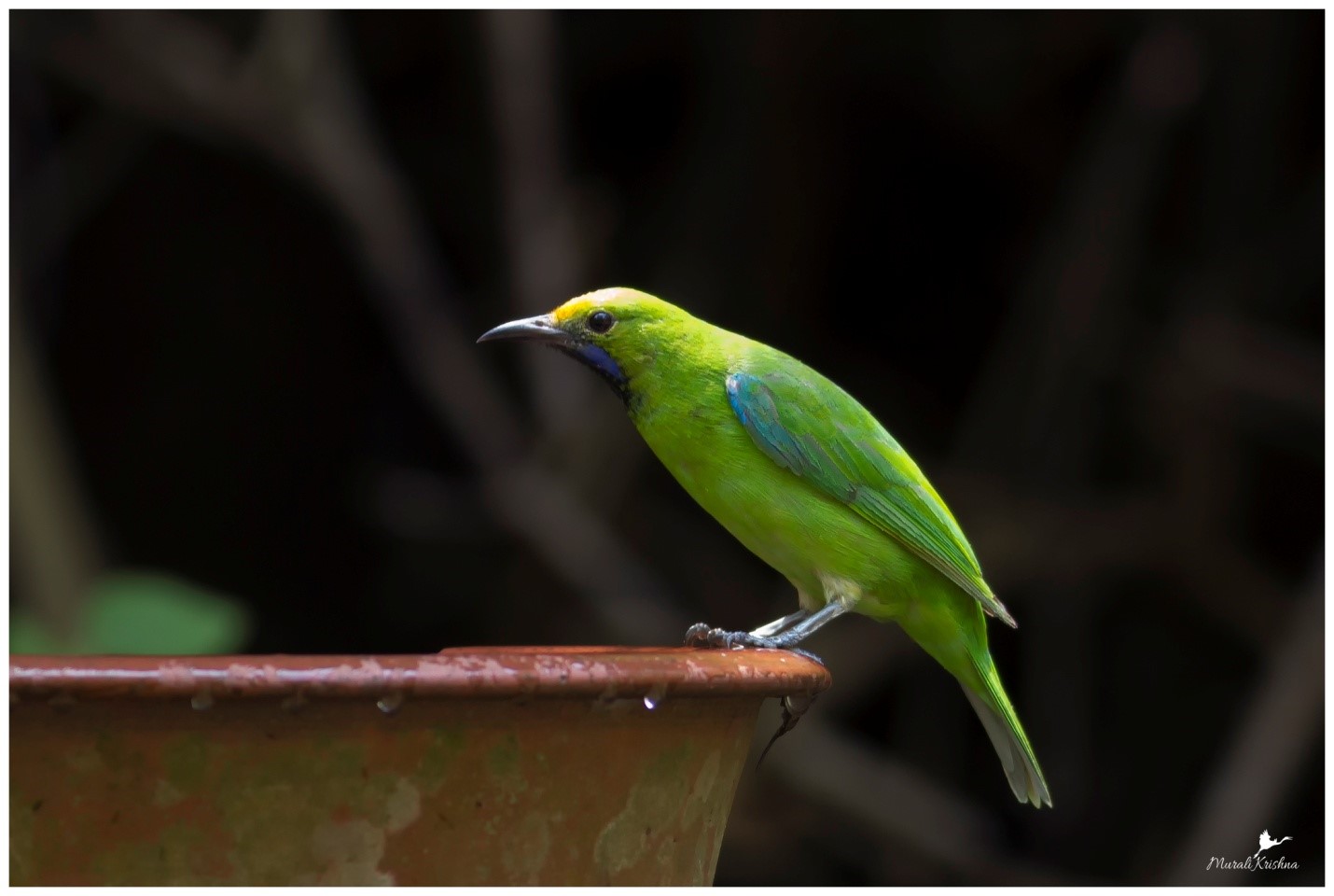 The golden-fronted leafbird (Chloropsis aurifrons) is a species of leafbird. The southern Indian race, C. a. frontalis, has a narrower yellow border to black face. The throat is black and it has a blue sub-moustachial stripe and duller orange forehead. Towards the extreme south of India and Sri Lanka the race insularis occurs which is slightly smaller than frontalis.