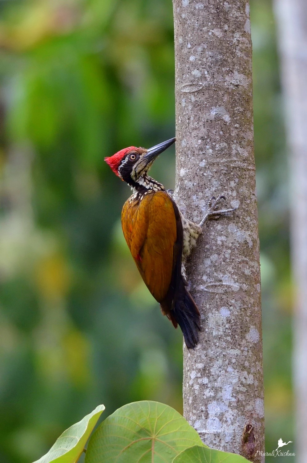 The Greater Flameback (Chrysocolaptes guttacristatus ) also known as Greater Goldenback, Large Golden-backed Woodpecker or Malherbe's Golden-backed Woodpecker, is a woodpecker species. The adult male Greater Flameback always has a red crown. Females have a crown color varying between subspecies, such as black spotted with white, yellow, or brown with lighter dots. Young birds are like the female, but duller, with brown irides.
