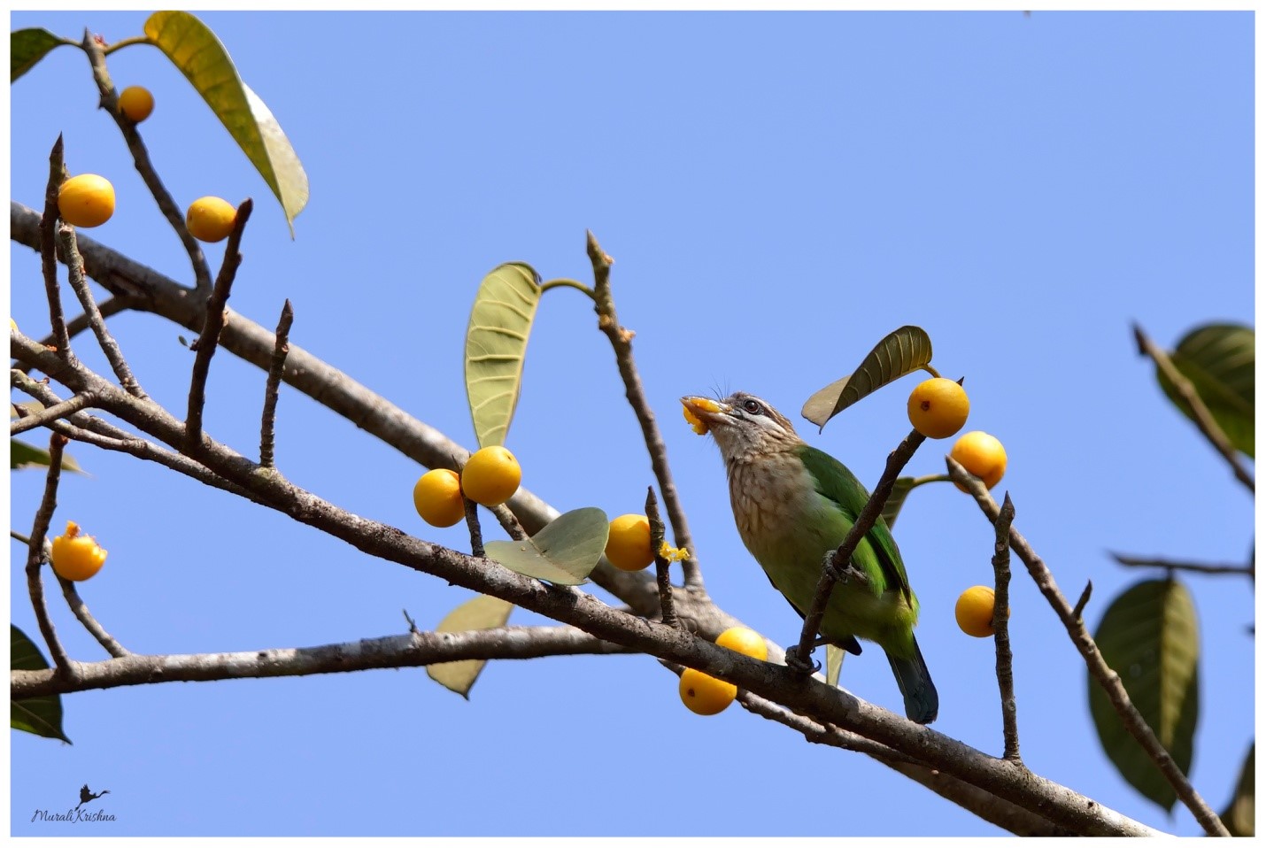 The White-cheeked Barbet or Small Green Barbet (Megalaima viridis) is a species of barbet found in southern India. It is very similar to the more widespread Brown-headed Barbet (or Large Green Barbet) (Megalaima zeylanica) but this species has a distinctive supercilium and a broad white cheek stripe below the eye and is endemic to the forest areas of the Western Ghats and adjoining hills. The Brown-headed Barbet has an orange eye-ring but the calls are very similar and the two species occur together in some of the drier forests to the east of the Western Ghats. Like all other Asian barbets they are mainly frugivorous although they may sometimes eat insects and they use their bills to excavate nest cavities in trees.